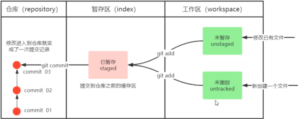 git工作目录下的文件会存在几个不同的状态,这几个状态会随着我们使用git指令而发生变化。具体如下图: